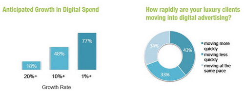 在數(shù)字媒體營銷投入上,有20%的接受調(diào)查的營銷者認為,從2011年到2012年在數(shù)字營銷的投入增長將超過18%,更有1%以上的營銷者認為這個增長速度將超過77%。上方右側(cè)圖也反映了營銷者在奢侈品數(shù)字營銷上的積極投入。