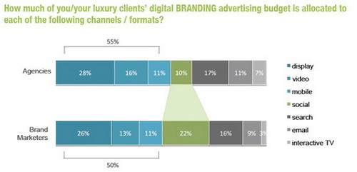 在數(shù)字媒體選擇方面,展示廣告(包括在線、視頻以及移動上的展示廣告)占了目前奢侈品牌廣告投放一半以上的預(yù)算。從廣告代理公司(Agency)以及品牌廣告主(Brand Marketers)看,存在差異的是在社會化媒體方面,廣告公司估計奢侈品牌在社交媒體上的投入比例約為10%,而廣告主則認為這個比例將達到22%。