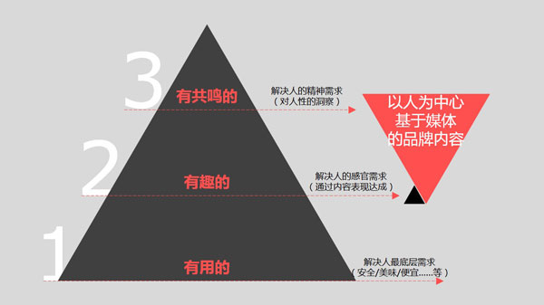 以人為中心的品牌內(nèi)容,這一理念最早出自菲利普科勒的《營(yíng)銷3.0》一書,他描述了一個(gè)新的營(yíng)銷世界,不同于以產(chǎn)品為核心的1.0時(shí)代、和以消費(fèi)者為核心的營(yíng)銷2.0時(shí)代,營(yíng)銷3.0時(shí)代更加注重人文層面、情感層面的需求滿足。它給我們提供了一個(gè)看待當(dāng)今消費(fèi)者的全新視角,它給我們指出了進(jìn)入馬斯洛需求模型最頂級(jí)“自我實(shí)現(xiàn)”的路徑。