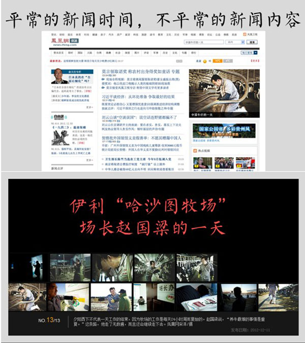 當(dāng)主角從牛奶變成牛仔,當(dāng)形式從信息變成故事,當(dāng)推廣從廣告變成新聞。鳳凰網(wǎng)派了一個(gè)攝影記者到了內(nèi)蒙古赤峰市哈薩圖牧場(chǎng),拍攝場(chǎng)長(zhǎng)趙國(guó)梁的一天,最后用13張圖片呈現(xiàn)在鳳凰網(wǎng)的首頁上,吸引每個(gè)看到這組圖片的用戶平均瀏覽時(shí)間長(zhǎng)達(dá)1分18秒,從而獲得與伊利牛奶工作人員的感性共鳴。