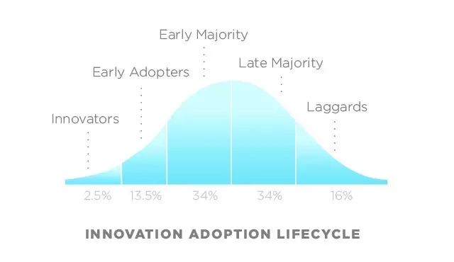 Everett Rogers 提出過(guò)技術(shù)采用生命周期理論(Technology Adoption Lifecycle),他指出,勇于嘗試一款名不見(jiàn)經(jīng)傳的新產(chǎn)品的公司,只占整個(gè)市場(chǎng)的 2.5%。