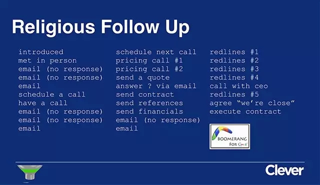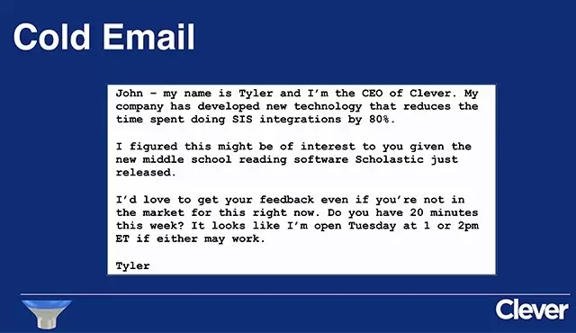 找到這些人有兩個(gè)途徑:一,是通過(guò)熟人;二,是通過(guò)會(huì)議現(xiàn)場(chǎng)。第一點(diǎn)不用細(xì)說(shuō),第二點(diǎn),我所說(shuō)的會(huì)議不是 CES、E3 這種,而是說(shuō)如果一群 CIO 要到某個(gè)小城的某家酒店開(kāi)會(huì),你要先想辦法獲得他們的出席名單、聯(lián)系方式,在會(huì)議開(kāi)始前就給每個(gè)人發(fā)郵件,再跟進(jìn)到現(xiàn)場(chǎng),抓住每一個(gè)推介自己的機(jī)會(huì)。Clever 早期的銷售工作幾乎就是在重復(fù)做這件事情,我們的初始用戶大部分都是靠這個(gè)方法接觸到。